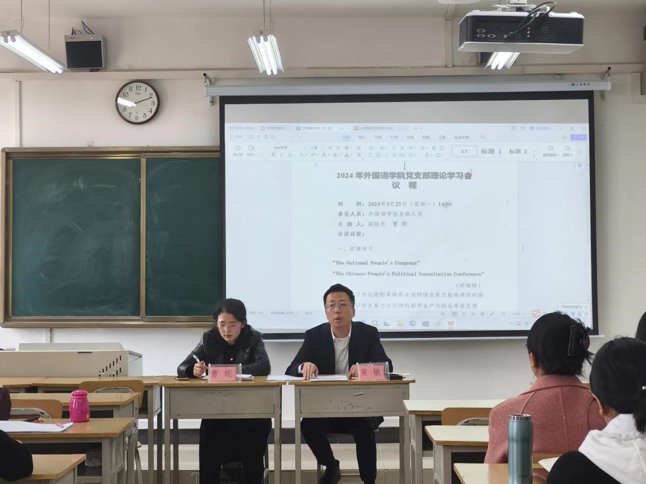 会议分为三个阶段,首先由祁雅婷老师聚焦全国“两会”精神,通过双语领学,详细讲解了“新质生产力”“全国一体化算力体系”等会议内容。同时,融入翻译方法的讲解以及课程思政的内容,全方位、多角度的解析了两会动态。随后会上传达了《陈刚、吴晓军在调研绿色算力基地建设时强调 加快发展以绿色算力为引领的新质生产力》以及省委常委召开会议精神等内容,结合棋牌游戏平台