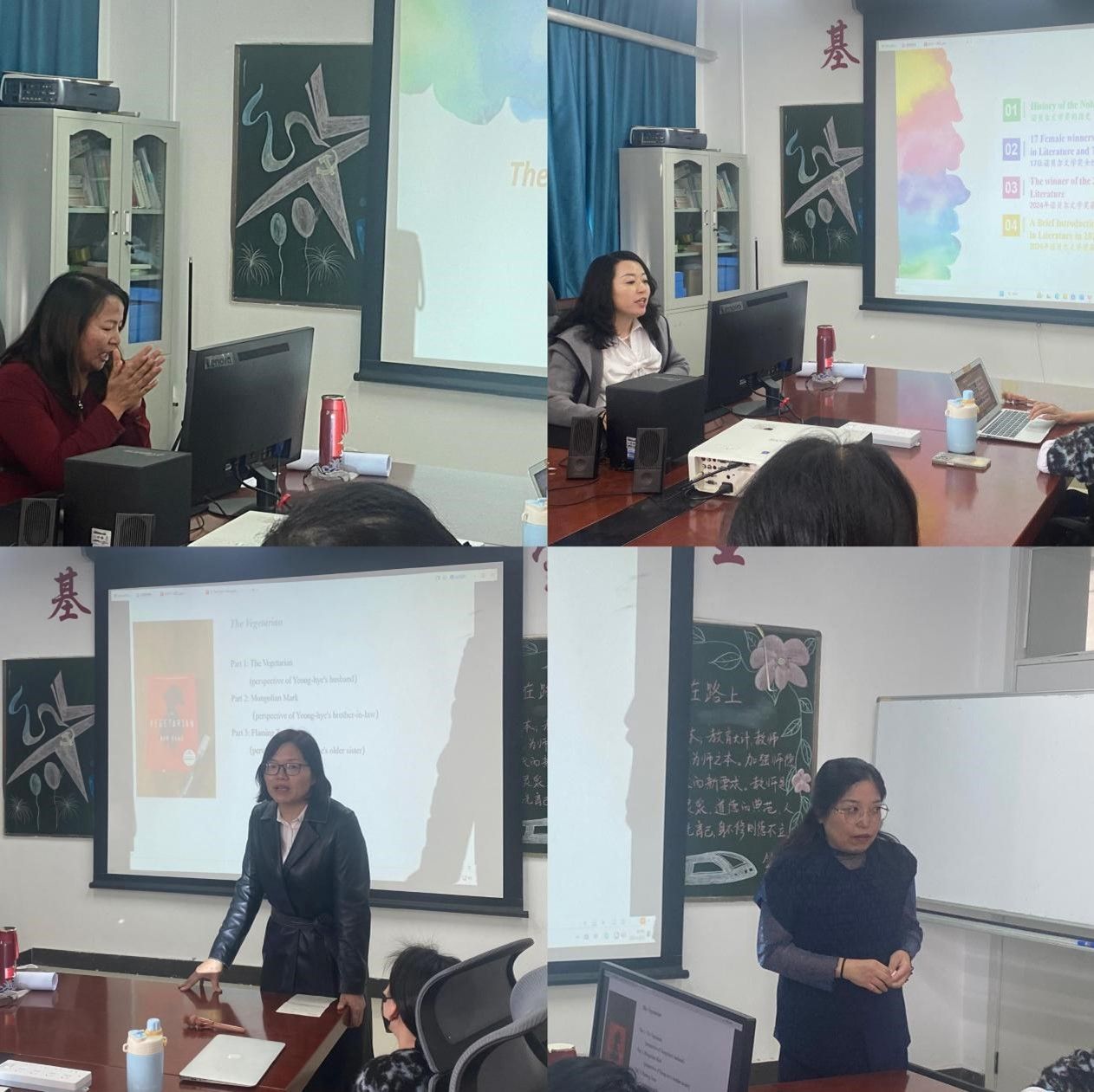 会议以“文学思想碰撞”为主题开展了教研室活动,马生华、张蕊、仲萍、和海印等四位教师以诺贝尔文学奖为主线,介绍了诺贝尔文学奖的历史、17位诺贝尔文学奖女性获奖者及作品。重点分享了2024年诺贝尔文学获奖者韩江的创作风格与特点。韩江作为首位获得诺贝尔文学奖的韩国作家,其作品直面历史创伤,揭露人类生命的脆弱,以诗歌和实验风格成为当代散文的创新者。她曾凭借《素食者》在国际上获得巨大成功,被翻译成多种语言。