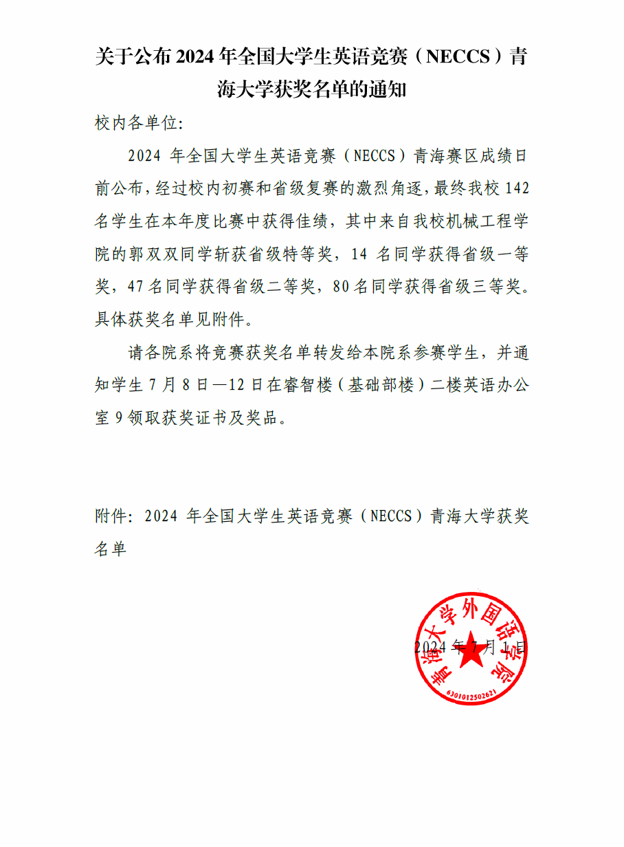 关于公布2024年全国大学生英语竞赛(NECCS)棋牌游戏平台 获奖名单的通知